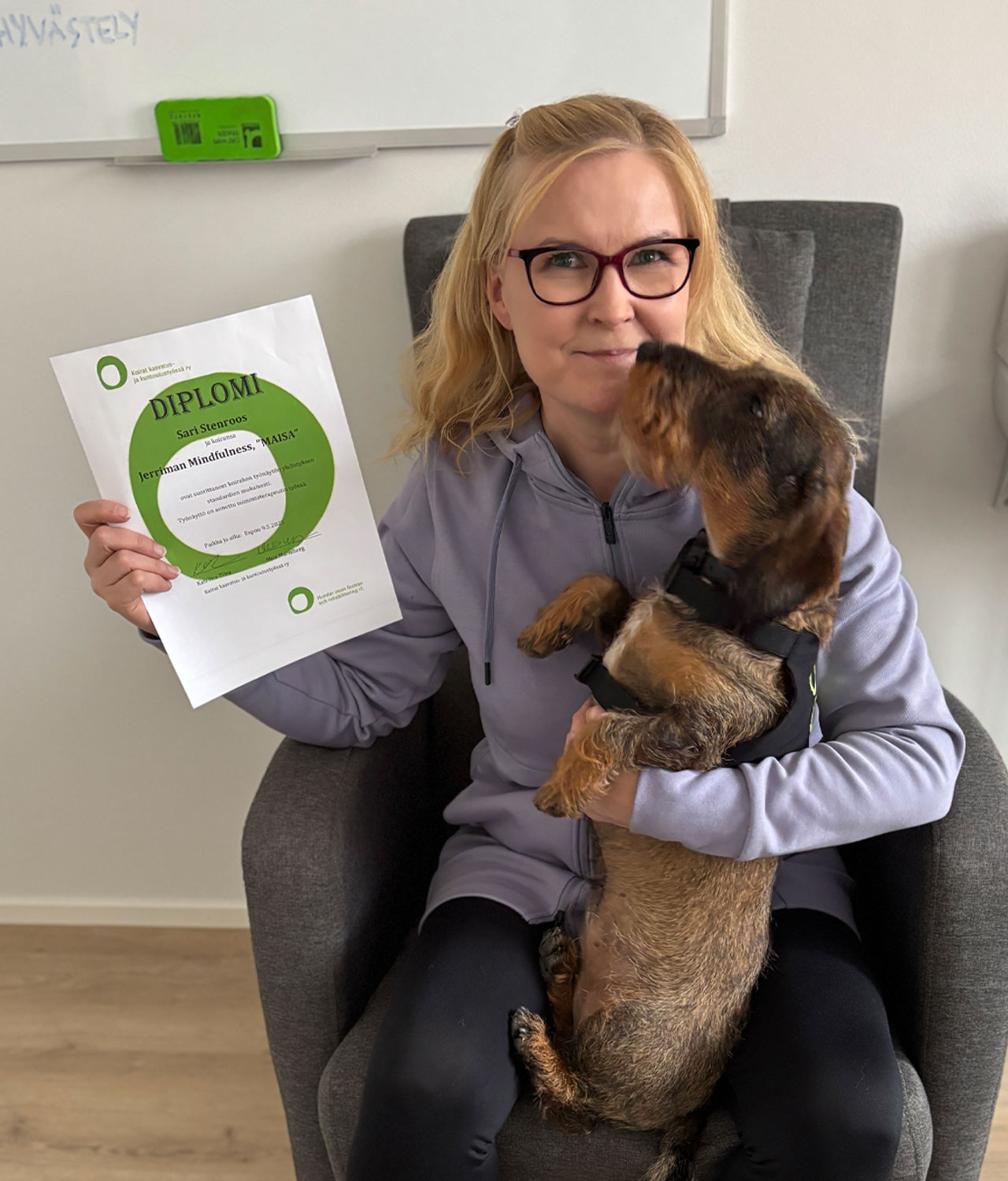 Olemme suorittaneet Maisan kanssa Koirat kasvatus- ja kuntoutustyössä ry:n soveltuvuusarvion 08/2023 ja työnäytön 05/2025 eli olemme virallinen kuntoutuskoirakko.